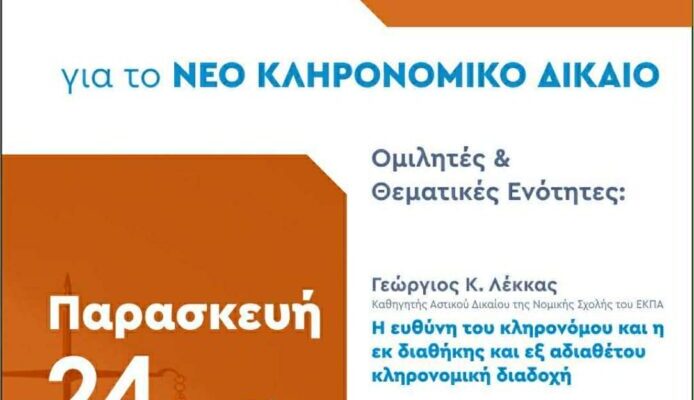 Η εκδήλωση είναι ανοιχτή στο κοινό και αναμένεται να αποτελέσει σημείο αναφοράς για τη συζήτηση γύρω από τις εξελίξεις στο πεδίο του Κληρονομικού Δικαίου.
