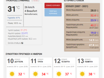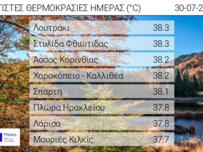 Θερμοκρασίες που τοπικά ξεπέρασαν και τους 38 °C σημειώθηκαν την Κυριακή 30/07/2023, με την υψηλότερη μέγιστη θερμοκρασία να καταγράφεται στο Λουτράκι και στη ...