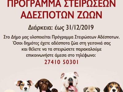 Στην μαζική στείρωση αδέσποτων ζώων προχωρά ο δήμος Ξυλοκάστρου Ευρωστίνης. Όπως ενημερώνει με ανακοίνωσή του, τα αδέσποτα αυξάνονται διαρκώς και υπάρχει επιτακτική ανάγκη ...