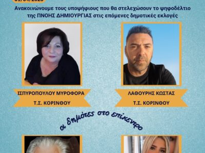 “Πολιτική διέξοδο” στα αυτοδιοικητικά πράγματα της Κορινθίας επιχειρεί να φέρει ο ομώνυμος συνδυασμός, ο οποίος θα συμμετάσχει στις επόμενες αυτοδιοικητικές εκλογές για τον ...