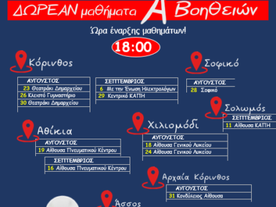 Συνεχίζονται τα δωρεάν σεμινάρια πρώτων βοηθειών στον δήμο Κορινθίων