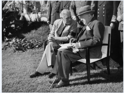 14 Ιανουαρίου 1943. Αριστερά, φορώντας λευκό κουστούµι, ποζάρει οΠρόεδρος των Η.Π.Α. Φραγκλίνος Ρούσβελτ. Δεξιά βρίσκεται οΠρωθυπουργός της Βρετανίας, Ουίνστον Τσόρτσιλ.Η φωτογραφία τραβήχτηκε στο ...