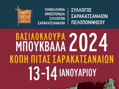 Διήμερο εκδηλώσεων που θα έχουν στο επίκεντρο την κοπή της πίτας του διοργανώνει ο Σύλλογος Σαρακτασαναίων Πελοποννήσου το ερχόμενο Σαββατοκύριακο 13 και 14 ...