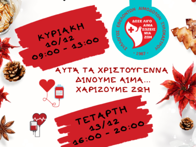 Με σύνθημα «Αυτά τα Χριστούγεννα δίνουμε Αίμα, Χαρίζουμε Ζωή» ο Σύλλογος Εθελοντων Αιμοδοτών Ξυλοκάστρου διοργανώνει Εθελοντικές Αιμοδοσίες στις 10 και 13 Δεκεμβρίου 2023, ...
