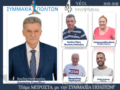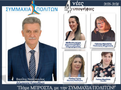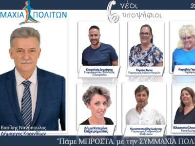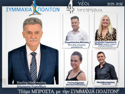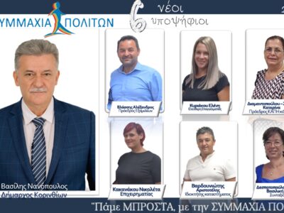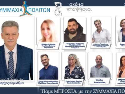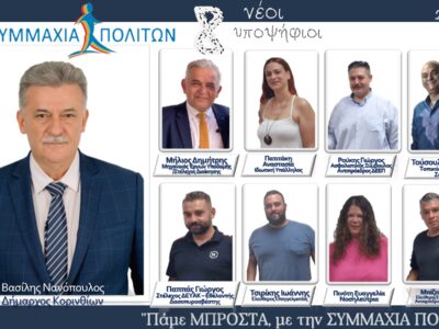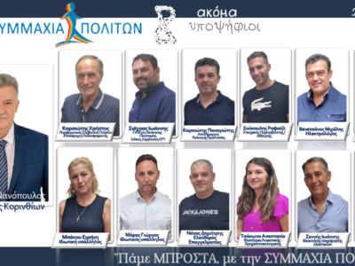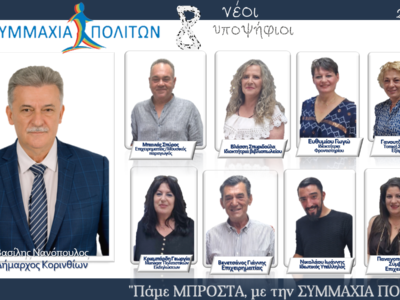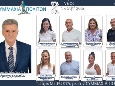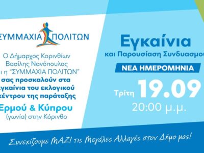 Tην Τρίτη 19 Σεπτεμβρίου στις 20:00 θα πραγματοποιηθούν τα εγκαίνια του εκλογικού κέντρου και η παρουσίαση του συνδυασμού “Συμμαχία Πολιτών” στην Κόρινθο.