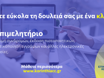 Το e-Επιμελητήριο είναι μια αναβαθμισμένη ψηφιακή υπηρεσία του ΕΠΙΜΕΛΗΤΗΡΙΟΥ ΚΟΡΙΝΘΙΑΣ που προσφέρει άμεσους τρόπους για την online εξυπηρέτηση σας! Mε τους κωδικούς ΓΕΜΗ της επιχείρησης ή των ...