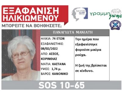 Silver Alert για την εξαφάνιση μιας ηλικιωμένης γυναίκας εκδόθηκε από την ΓΡΑΜΜΗ ΖΩΗΣ. Πρόκειται για την κυρία Παναγιώτα Μανιάτη, 74 ετών, η οποία ...